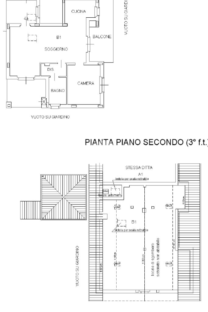 Al primo piano si viene accolti da un ampio soggiorno di circa 45 mq, luminoso e con accesso diretto a due spaziosi terrazzi. La zona giorno comprende anche una sala da pranzo e una cucina abitabile, ben separate, oltre a un comodo bagno con antibagno.