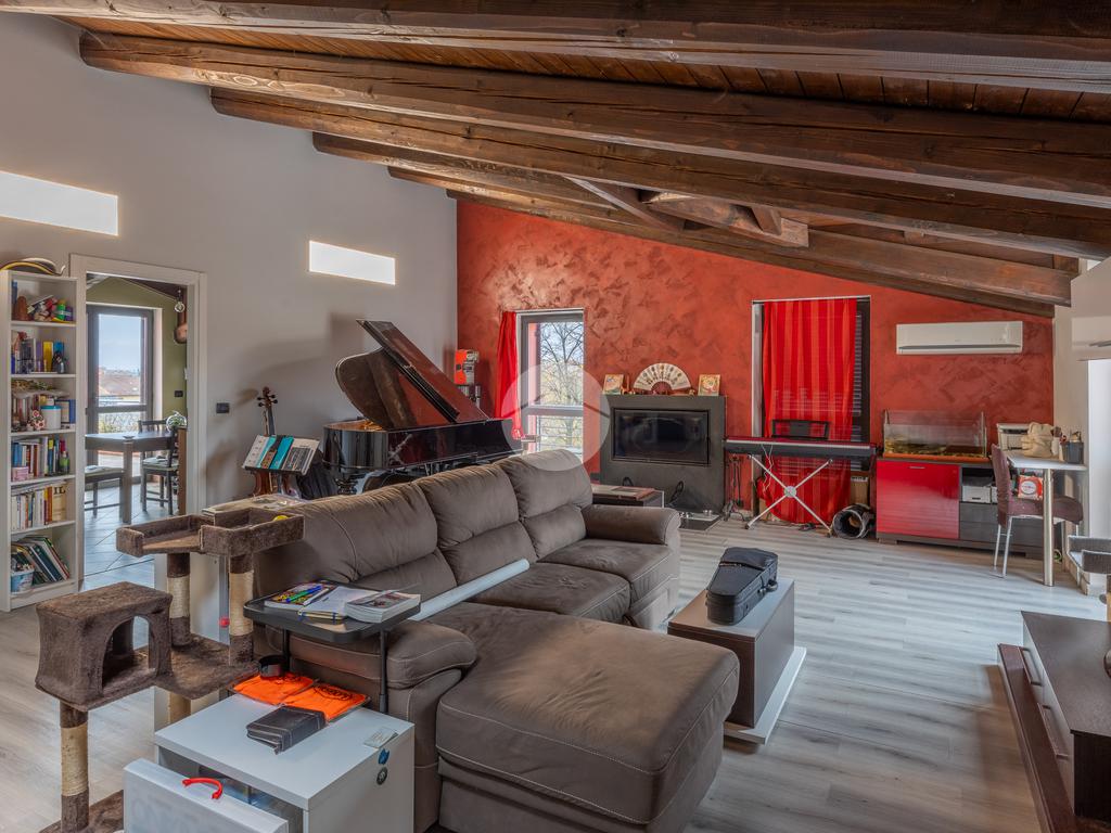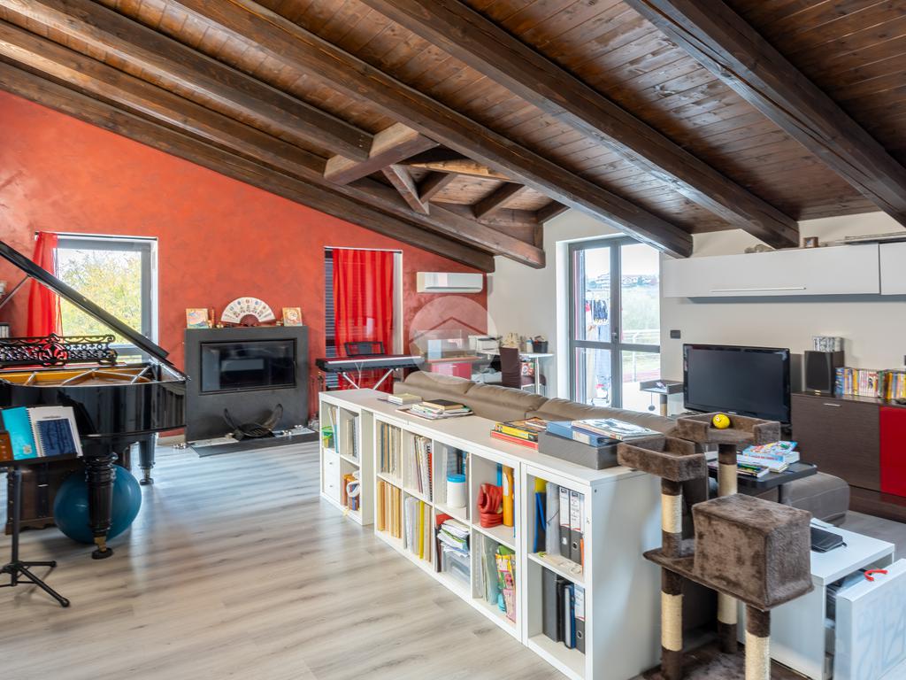 L’ingresso introduce a una spaziosa zona giorno, resa accogliente da un camino a vista e perfettamente distribuita, dalla quale si accede ai vari ambienti della casa. Da qui si apre il primo terrazzo vivibile, ideale per momenti di relax all’aria aperta o per piacevoli pranzi e cene in famiglia e con gli amici.