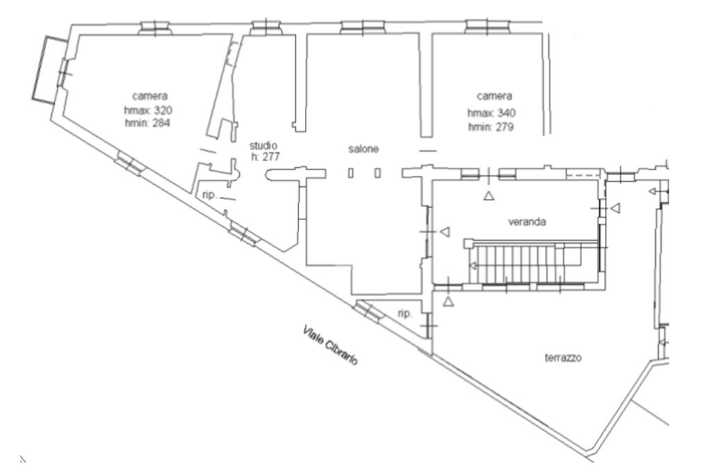 Attualmente l’immobile è totalmente da ristrutturare ed è composto da una cucina abitabile, adiacente ad una camera da letto, un ampio salone, uno studio, una seconda camera matrimoniale dotata di balcone privato e un pratico ripostiglio.