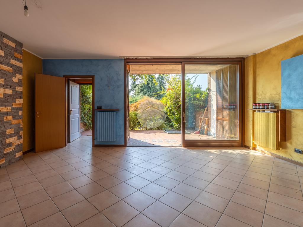 Sullo stesso livello si trovano una cucina abitabile e un bagno, entrambi con accesso diretto a un secondo giardino privato, perfetto per momenti di relax o pranzi all’aperto.